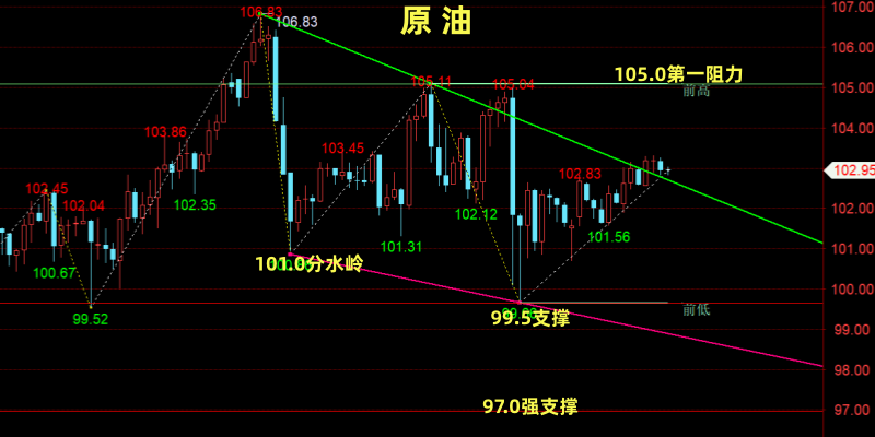 【个人建议:高空为主;WTI分水岭:101.0/桶!以上观点,仅供参考;分散合理布局,严控风险!关注笔者(企鹅:304236956)投资不焦虑 ,交易有方法】
